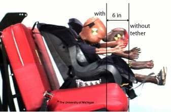 A top tether works by keeping your child’s car seat back so his or her head won’t move as far forward in a crash. This can reduce the risk of head and neck injuries. This photo, from the University of Michigan Transportation Research Institute (UMTRI), shows a crash test of a car seat with a top tether and one without. In the seat without a top tether, the crash test dummy’s head moved forward six inches more than the dummy in the car seat with a tether.